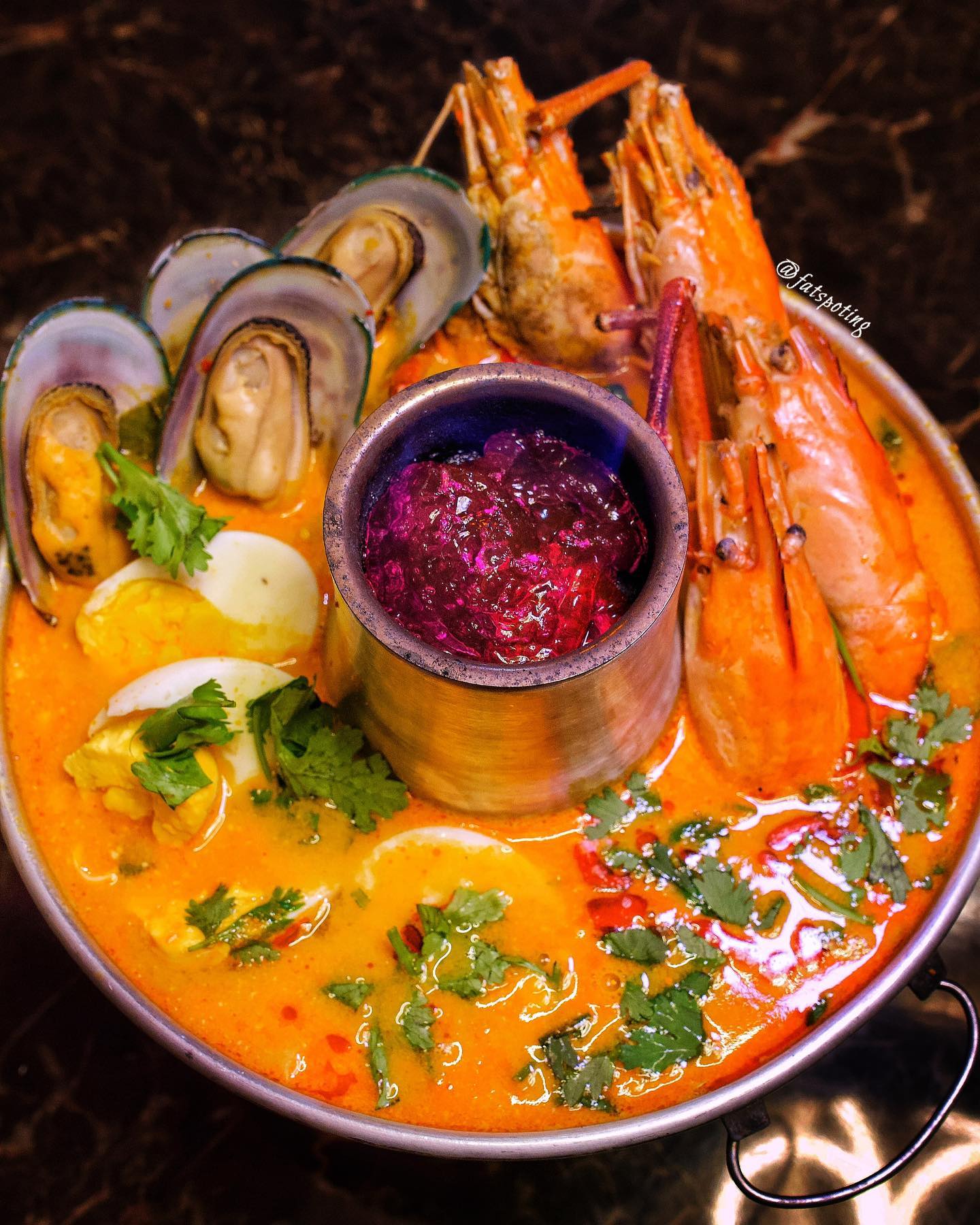 A sizzling cauldron of simmering rich Tom Yum broth filled to the brim with an array of seafood delights.