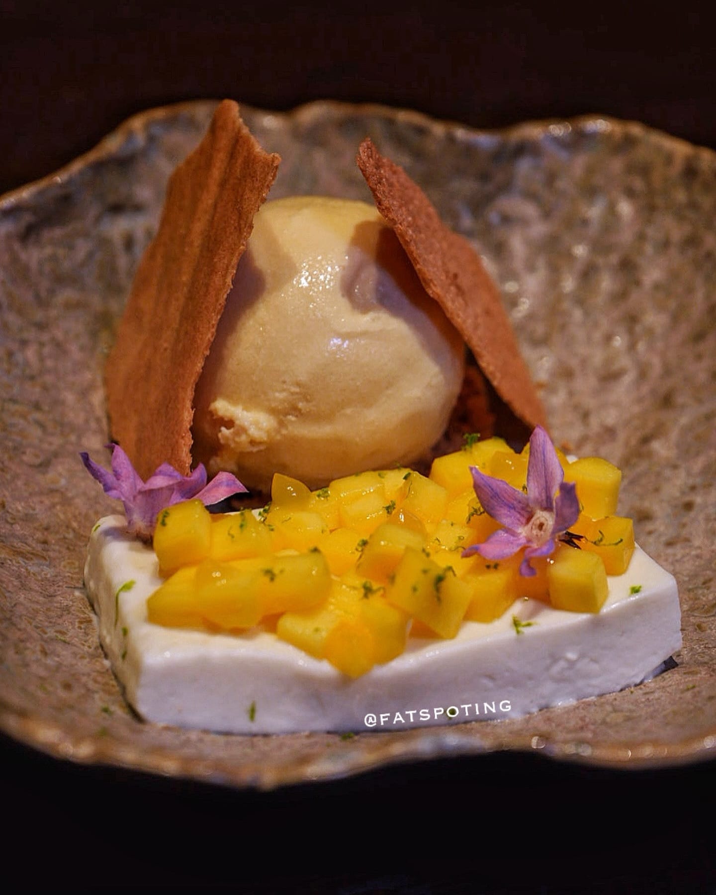 Mangoes atop a panna cotta-like egg custard, infused with Southeast Asian accents of coconut, pandan and kaffir lime. A homemade scoop of gula melaka ice cream ties all the elements together.