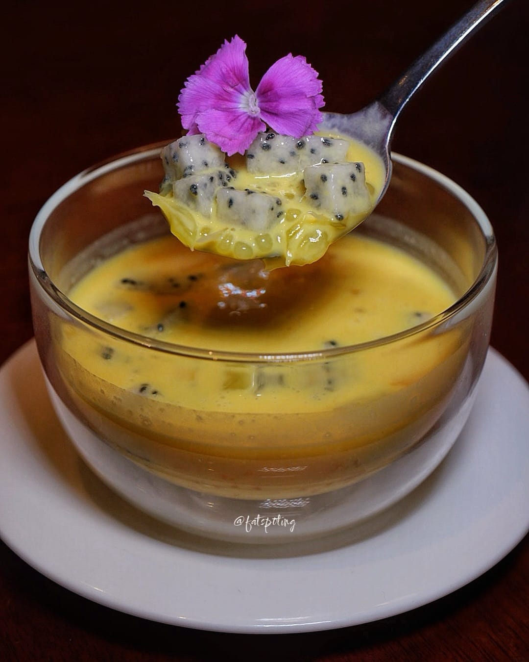 Concluding the meal is the Chilled Puree of Mango Sago and Pomelo with Dragon Fruit. This dessert is both visually appealing and palate-cleansing, with the sweetness of mango puree complemented by the slight bitterness of pomelo and the subtle crunch of dragon fruit.
